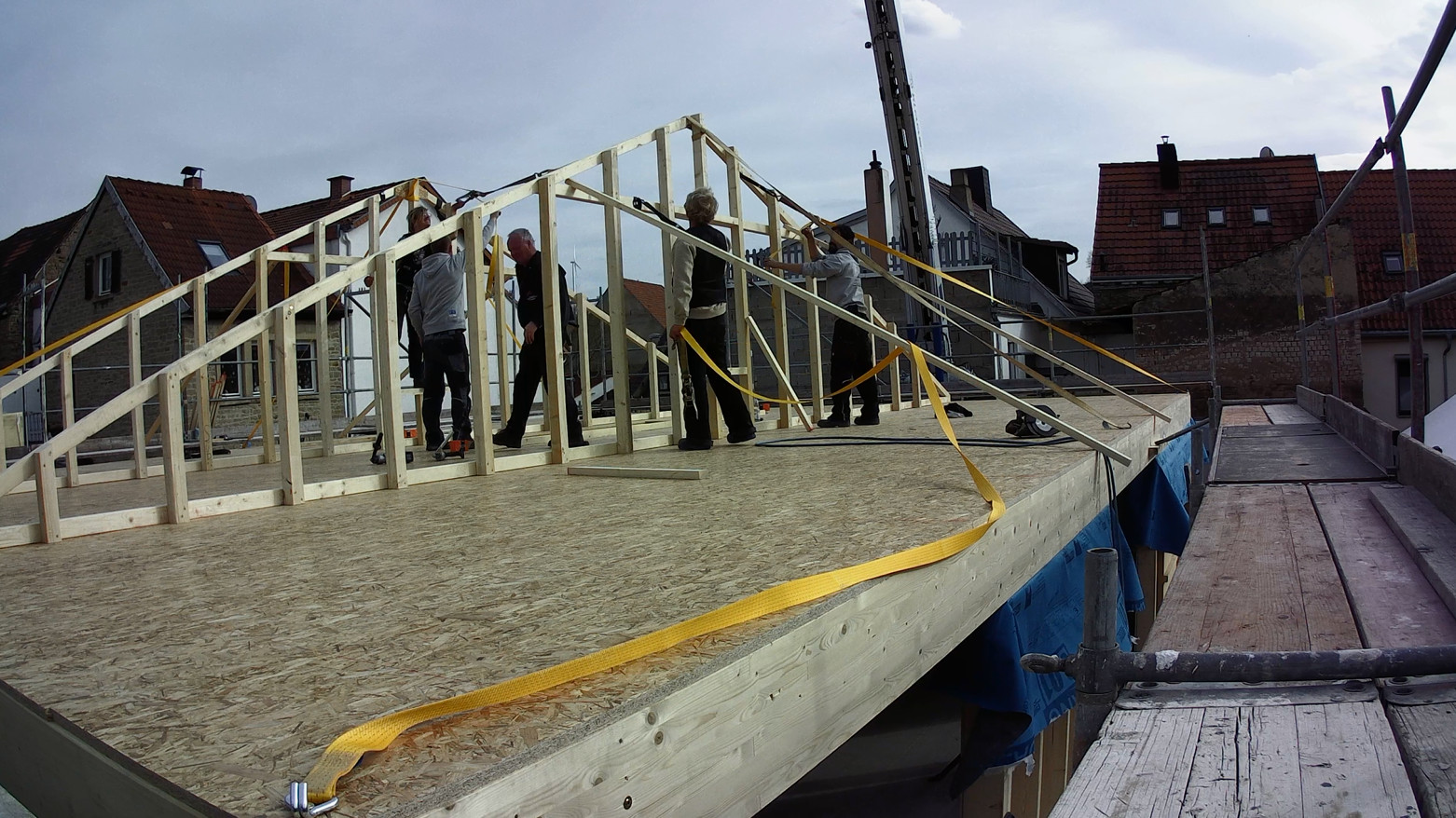 Beim Abbinden und Herstellen von Dachstühlen, Wänden und sonstigen Bauteilen setzen wir auf maschinell unterstützte Handarbeit.